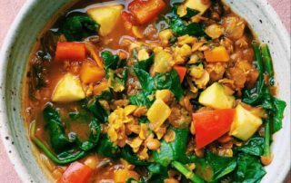 A cozy plant-based instant pot lentil soup that can be prepared in under 30 minutes.
