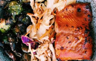 15 minute air fried teriyaki salmon with roasted everything but the bagel Brussels sprouts + mushrooms, with a cashew butter slaw.