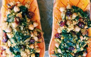 Stuffed butternut squash boats with a curried quinoa and chickpea stuffing.