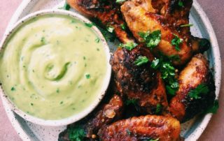 Chicken wings with an avocado ranch dipping sauce is the perfect game day snack. You can either bake them or cook in your air fryer for an extra crisp factor.