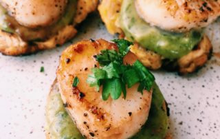 The perfect little bite size appetizer for your next party. Seared scallops on tostones with an avocado crema. They may look hard and fancy but I promise they are the easiest little appetizer.