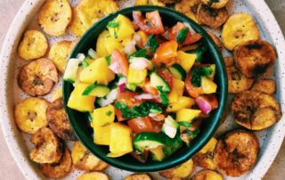A fresh mango salsa with some homemade air fried plantain chips for the perfect summer time appetizer or snack idea.