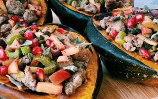 Stuffed acorn squash with a flavorful sage chicken and apple sausage filling.