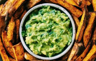 The easiest sweet potato fries cooked in an air fryer to make them extra crispy paired with some creamy guacamole.