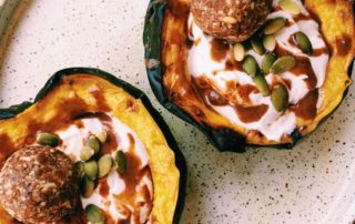 Stuffed breakfast acorn squash with loaded coconut probiotic yogurt, almond butter, pumpkin seeds, and a maple apple blissball.