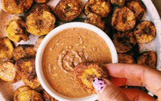Cinnamon vanilla madagascar ghee plantain chips dipped in some creamy almond butter.
